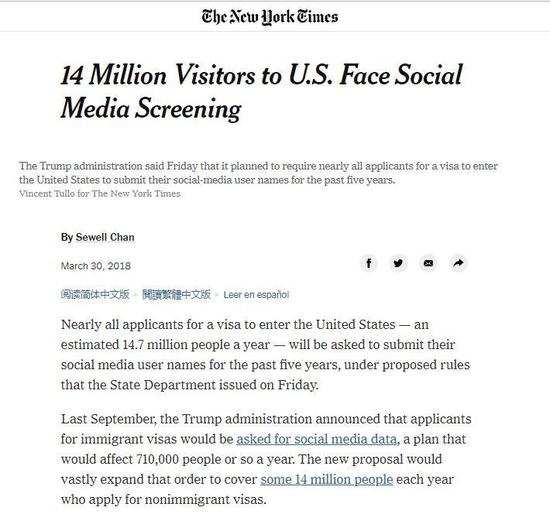 就在去年3月的时候,美国《纽约时报》就报道说特朗普政府为了加大对进入美国的外国人的审查力度,早在2017年9月就宣布想收集申请人的社交网站信息进行审查。而2018年3月时,美国国务院则进一步开始筹划这个计划,准备要求申请人上报自己过去5年来所使用的社交账号名称,并把范围从原本的移民签证范围扩大到了几乎所有美国签证上,导致大约每年会有1400万来美访客受到影响。