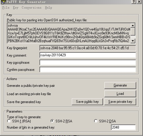 该工具可以生成三种格式的key :SSH-1(RSA) SSH-2(RSA) SSH-2(DSA) ,我们采用默认的格式即SSH-2(RSA)。Number of bits in a generated key 这个是指生成的key的大小,这个数值越大,生成的key就越复杂,安全性就越高。这里我们写2048.