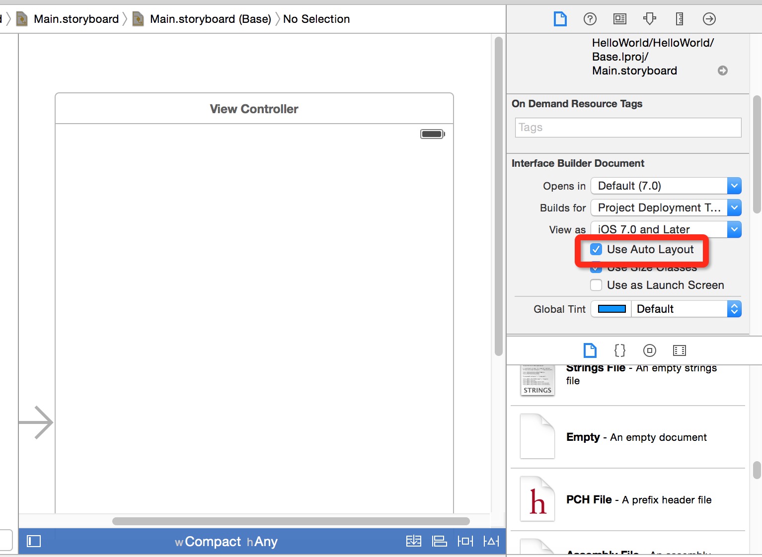 6、打开main.storyboard,默认看到一个简单的空白的应用界面,大小为平板界面大小。 如果开发都只需要开发兼容iphone手机的app,那么可以把Use Auto Layout的勾去掉(默认为勾上)。
